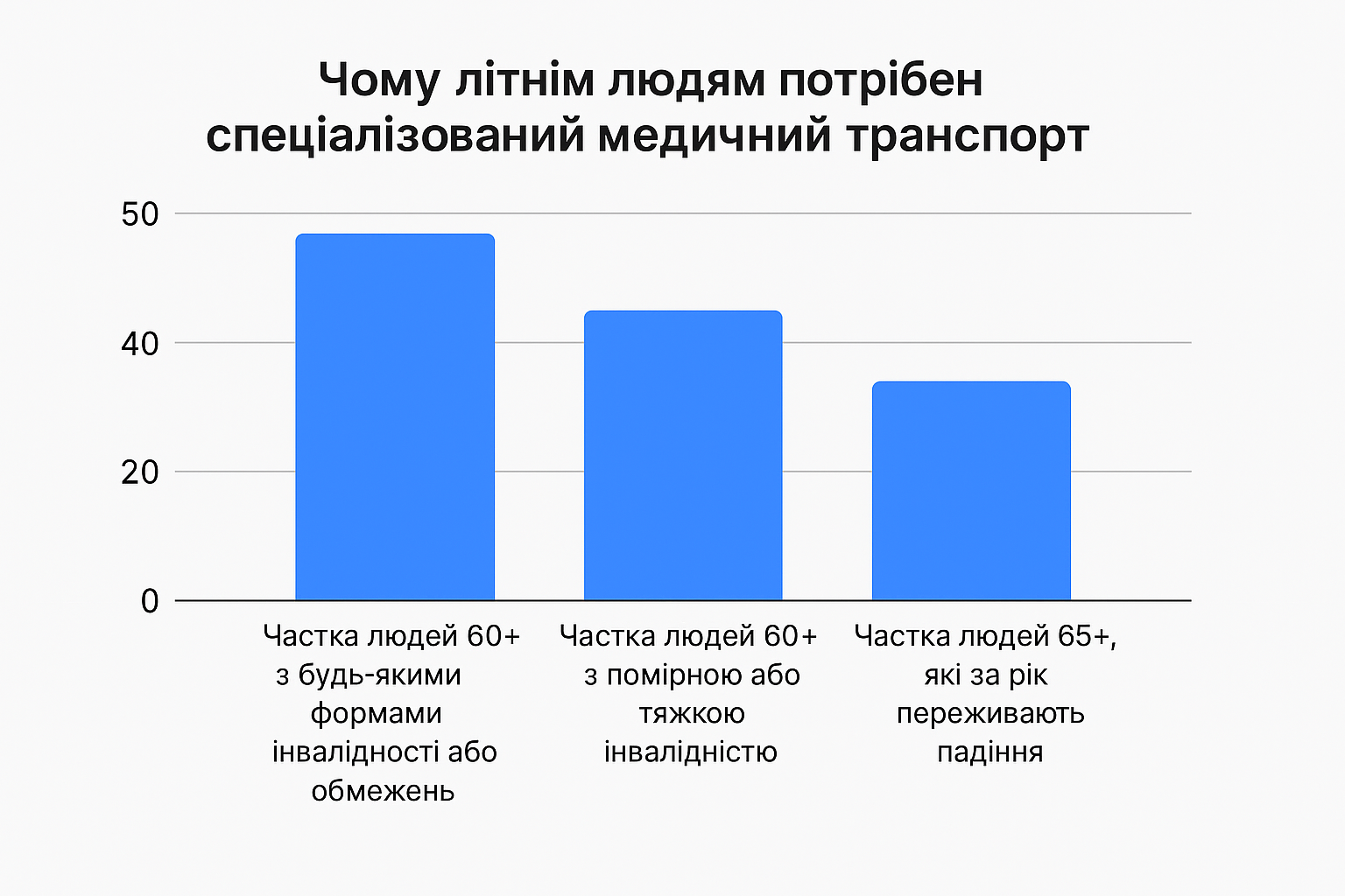 За дослідженням ВООЗ, близько 46% людей старше 60 років живуть з інвалідністю, а понад 250 млн людей похилого віку зазнають помірних або важких обмежень по здоров'ю. Окремо дослідження зі старіння показують, що близько третини людей 65+ щорічно переносять падіння, а падіння — одна з провідних причин травм та втрати незалежності у похилому віці. Це безпосередньо пояснює, чому перевезення та супровід лежачих хворих мають бути професійними.
